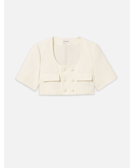 A cropped jacket cut in textured cotton tweed. Designed with a scoop neckline, short sleeves, flap pockets, and a double-breasted button front. Tailored and structured with a clean finish. FRAME Women's The Tweed Cropped Jacket White Cotton Size XS