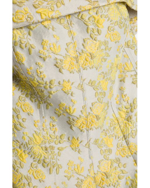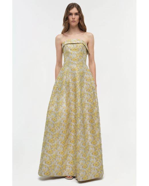 SPRING 2026 WOMEN'S COLLECTION The Octavia Jacquard Strapless Gown in Buttercream. This strapless dress features an exquisite floral jacquard design, creating a striking blend of texture and pattern. Its sculpted silhouette and detailed craftsmanship lend a timeless elegance and sophisticated appeal to the overall look. SIMKHAI Women's Octavia Jacquard Strapless Gown in Buttercream, Size 0