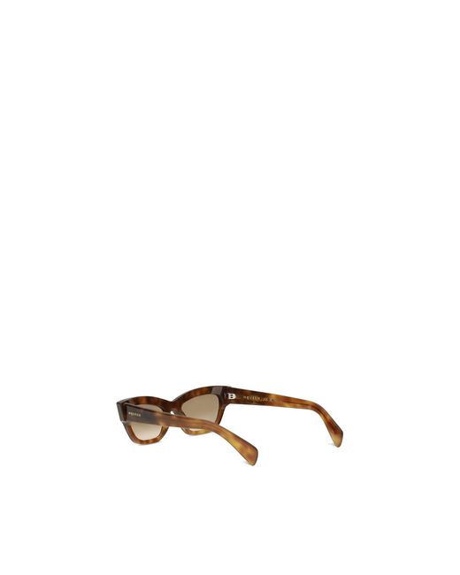 The Cat-Eye Sunglasses by Alexander McQueen stand out for their feminine and sophisticated cat-eye silhouette. The design is embellished with a T-bar on the sides: the light gold T-bar is integrated into the temples and finished with the laser-engraved McQueen logo, a detail that lends an elegant and distinctive touch to the accessory. Season: SS26 Composition: 100% Acetate