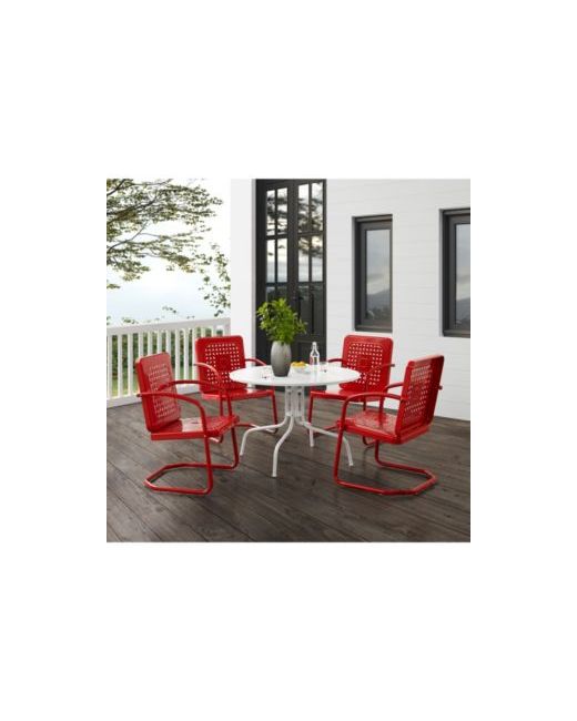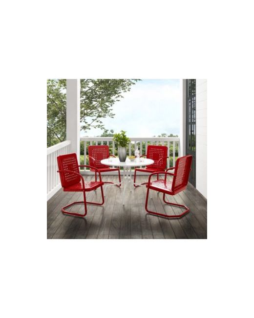 Four retro styled chairs in vibrant colors surround a simple metal dining table for a fun and functional outdoor dining experience. Each chair features a square back with a unique basket weave design that allows air to circulate, adding to the comfort of the seat.