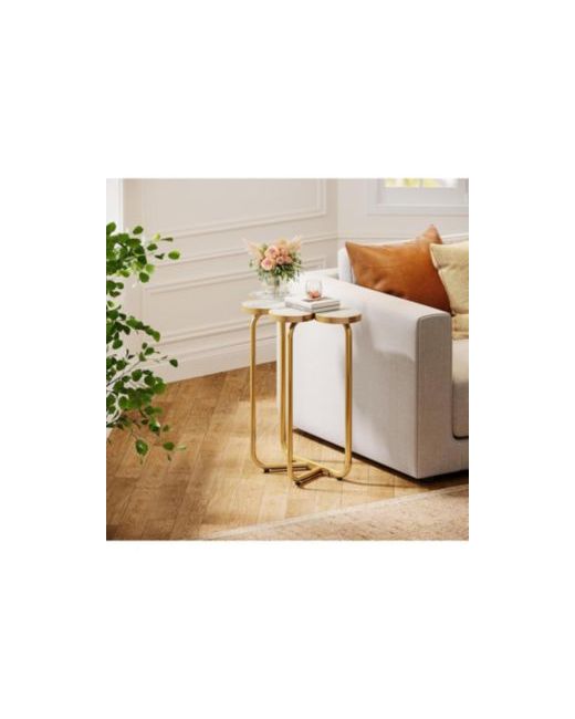 Faux Marble End Table Set of 2 Tier Round Side with Shelves Modern Gold Nightstand Bedside Small Coffee Accent for Li
