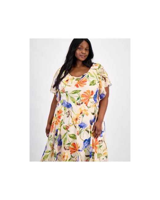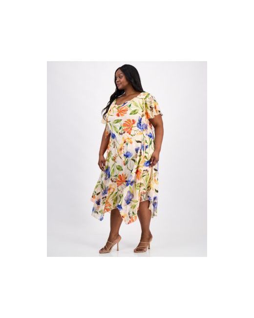 Fluid and feminine, this plus size dress by Robbie Bee features an elegant cowl neckline and romantic flutter sleeves. Its vibrant print and draped silhouette flatter your curves with a touch of effortless glamour.