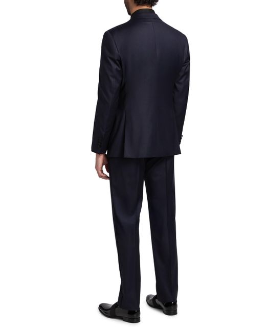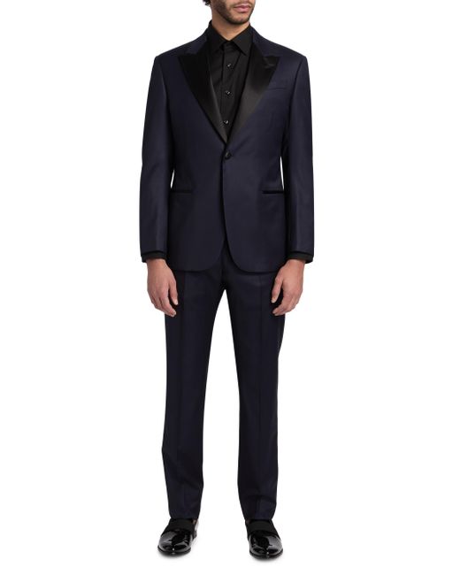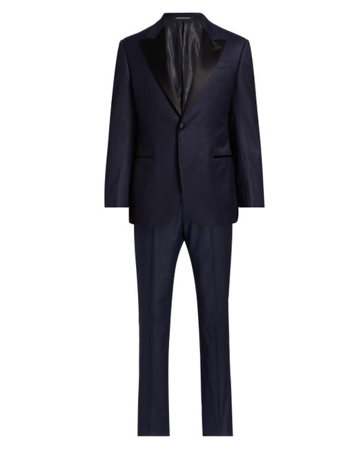 This tuxedo from Emporio Armani is crafted of virgin wool. The jacket is detailed with contrast peak lapels and the pants are designed with side slip pockets. 99% virgin wool/1% elastane. Dry clean. Made in Italy. JACKET Peak lapels Long sleeves, button cuffs Chest pocket Side welt pockets Button-front closure Combo: 57% polyester/43% silk Lining: 100% viscose Combo: 100% polyester PANTS Belt loops Side slip pockets Zip fly, button closure Lining: 65% acetate/35% viscose SIZE & FIT Model measurements: 6'2" tall, 40" chest, 31" waist Model is wearing a US size 40R. Men Luxury Coll - Emporio Armani C > Emporio Armani > Saks Fifth Avenue. Emporio Armani. Color: Navy. Size: 42.