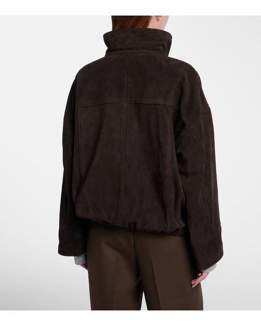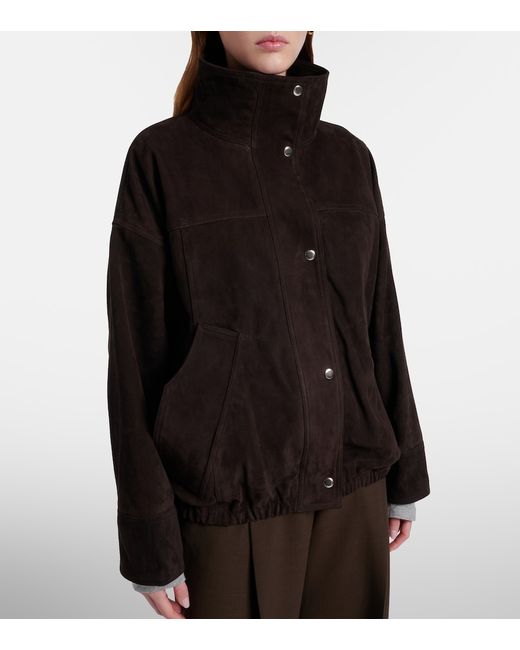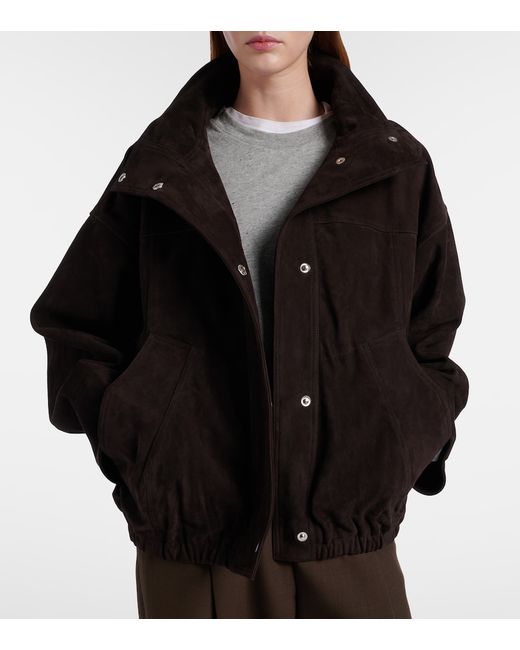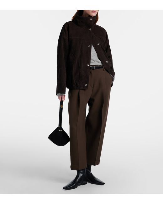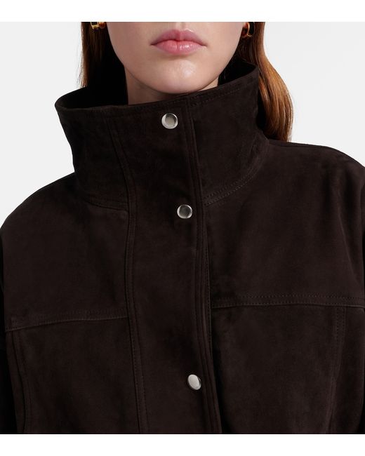Material: 100% goat leather (suede). Care instructions: specialist clean. Made in India. Designer color name: Dark Chocolate. Lining: 100% viscose. Closure: snap-buttoned front. Pockets: side welt pockets. Hem: elasticated. Leather.