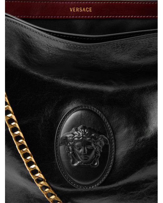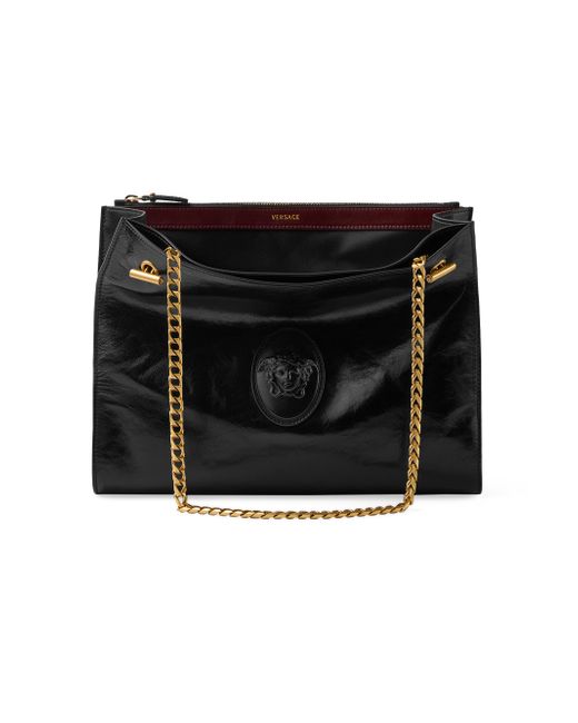 This medium shoulder bag from Versace, crafted of leather, features the label's signature Medusa logo at the lock and two shoulder straps. Two shoulder straps Interior: two zip compartments Flap with flip-lock closure Leather Lining: leather Trim: leather Made in Italy SIZE About 12.6"W x 9.8"H x 6.5"D ABOUT THE BRAND Founded in 1978, Versace is instantly recognizable by the signature Medusa head logo, chosen by founder Gianni Versace for its Greek symbolism. The Italian label is known for its luxe, bold clothing and accessories-think gilding, oversized logos and punchy prints. Since taking over artistic direction, Gianni's sister Donatella Versace has maintained the brand's strong identity, with a renewed vision to give customers the ultimate freedom to express themselves. Handbags - Italian Designer Handbag > Versace > Saks Fifth Avenue. Versace. Color: Black Gold.