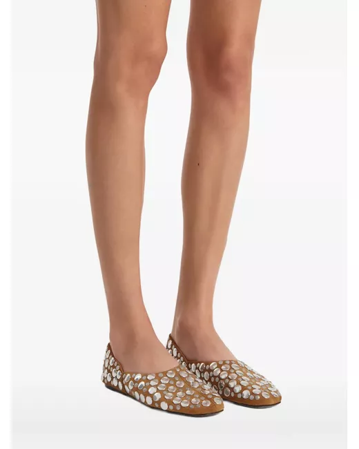 A soft, slipper-like flat in velvety suede studded with mirror-polished palladium discs of varying sizes. Crafted in Italy with traditional sacchetto construction and a padded insole that moves with the foot for cloud-like comfort. The buffed, rubber-injected outsole is treated to enhance durability, while the hint of a heel adds stability. brown studded discs
