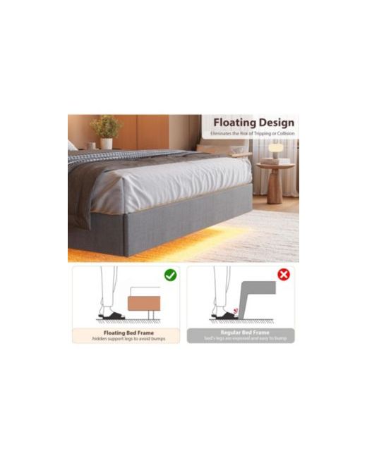 This Queen Floating Bed Frame has an Led-lit headboard with Usb charging, solid wood slat support, and a noise-free, modern design, no box spring required, the grey upholstered platform is quick to assemble and brings effortless style to your space.