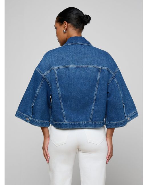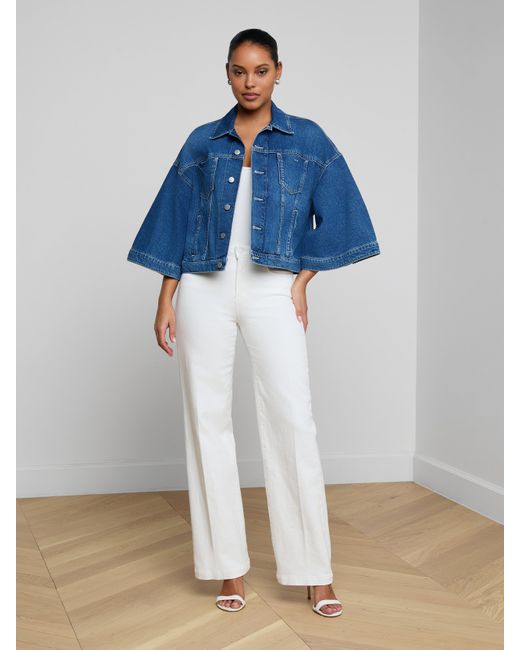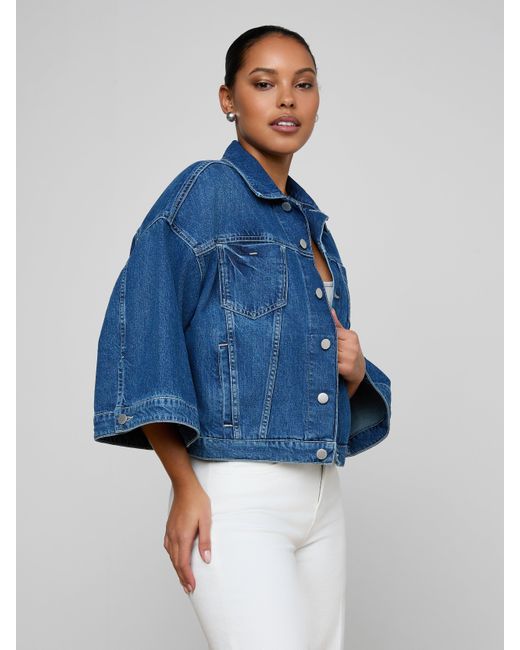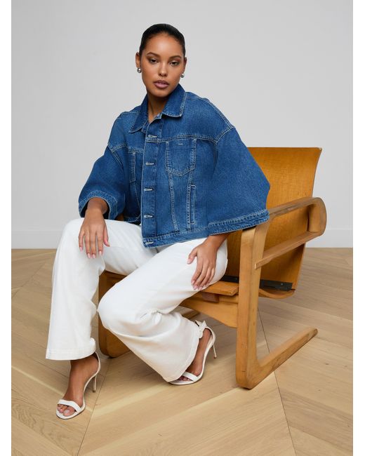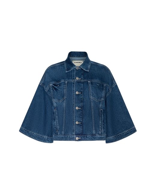 The jean shirt jacket has a bold new look. Designed with dramatic cape sleeves, the Silas adds a sculptural shape to any look. Give your everyday uniform a refresh with this easy, wearable statement. • All-cotton denim• Patch & welt pockets• Button closures L'AGENCE Silas Cape Jacket In Orwood