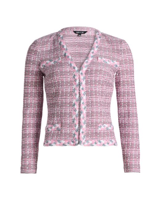 This Misook knit jacket is crafted of tweed, featuring shoulder pads and a braided trim. V-neck Padded shoulders Long sleeves Button-front closure 76% acrylic/24% nylon Trim: 90% acrylic/10% polyester Hand wash Imported SIZE & FIT About 21" from shoulder to hem Model measurements: 5'10" tall Model is wearing a US size Small. Modern Collections - Modern Coll > Misook > Saks Fifth Avenue. Misook. Color: Pink Parfait Multi. Size: Small.