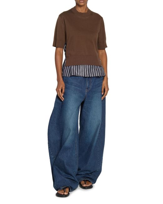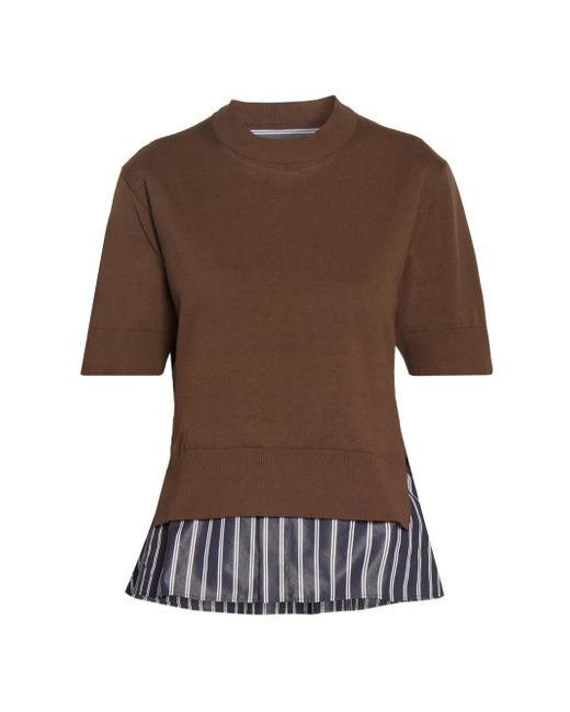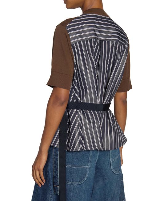 This poplin pullover sweater from Sacai is crafted of cotton and features a seamed back with a belted waist. Crewneck Short sleeves Rib-knit trim Belted Pulls over 100% cotton Combo: 65% polyester/35% cotton Lining: 100% polyester Dry clean Imported SIZE & FIT Model measurements: 5'10" tall Model is wearing a US size 4. Advanced Designer - Sacai > Sacai > Saks Fifth Avenue. Sacai. Color: Navy Blue Stripe. Size: Small.
