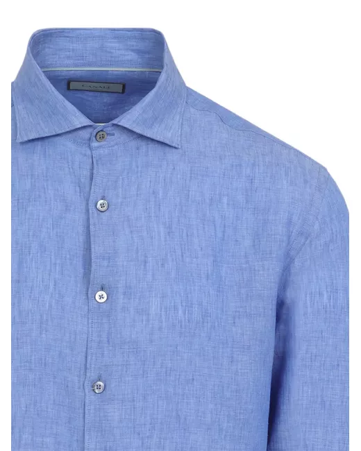 bright blue button fastening long sleeves point collar buttoned cuffs linen