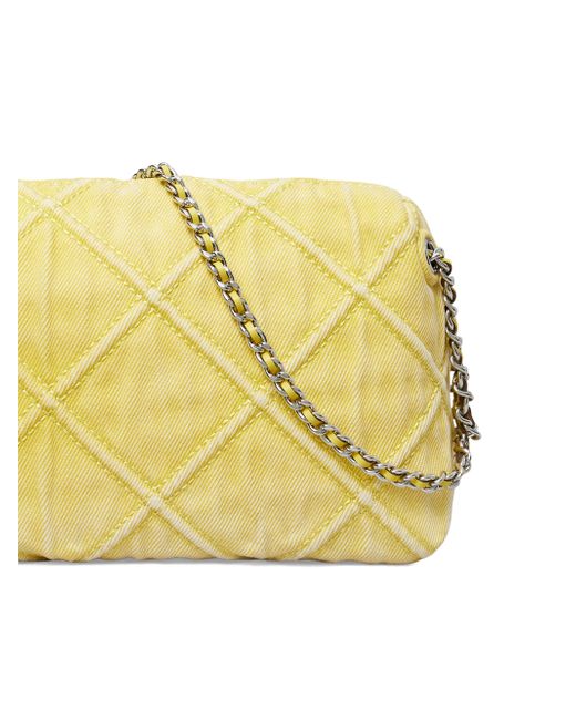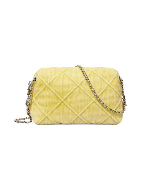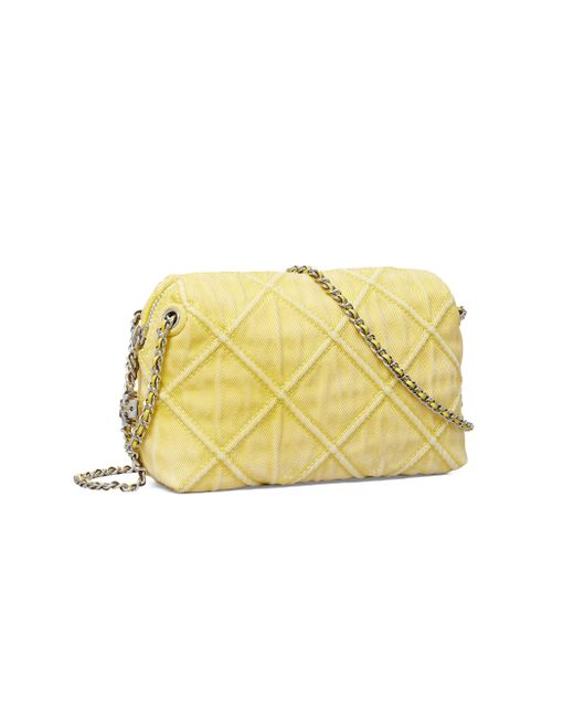 The Fleming crossbody bag from Tory Burch is crafted of pigment-dyed, triple-washed denim with a suede-like feel and diamond-pattern pintucks. This design features a leather-laced chain-link strap and Double T charm. Crossbody strap Interior: one card slot Top zip closure 100% cotton Lining: 100% polyester Imported SIZE About 7"W x 4.5"H x 2.4"D Crossbody strap: about 22.25" drop ABOUT THE BRAND Since debuting her brand in 2004, New York-based designer Tory Burch has made an impact on the fashion world with her handbags and shoes, and playful-yet-polished clothing. Today, Burch remains inspired by color and travel, with her vibrant collections bursting with prints, and her instantly recognizable double-T logo drawing from Moroccan architecture. Handbags - Tory Burch Handbags > Tory Burch > Saks Fifth Avenue. Tory Burch. Color: Yellow.
