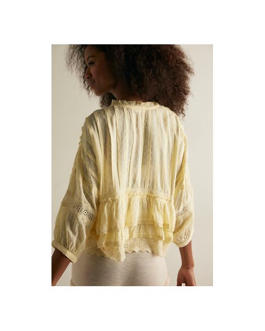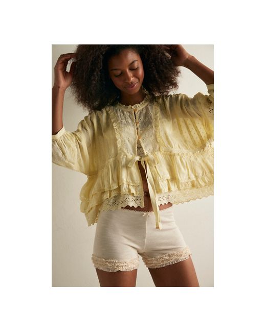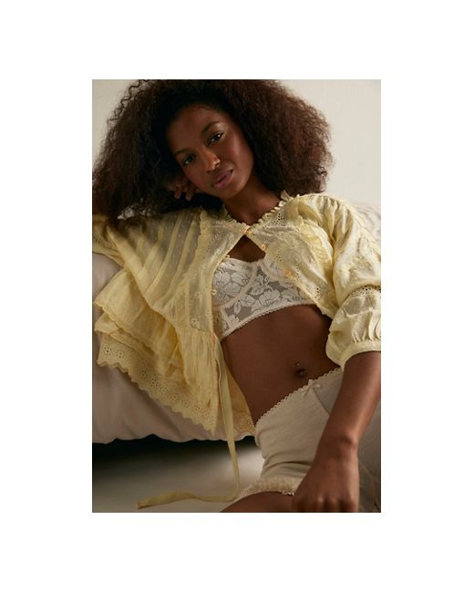 Exude romance in this dreamy bed jacket from Intimately, featuring a soft, embroidered fabrication adorned with pintucks, ruffles, and eyelet lace, plus a layered peplum silhouette with scalloped trim for endless allure. * Lightweight, embroidered fabrication * Bed jacket with front button closure * Adjustable tie at center front * Puffed ¾ sleeves Little Love Bed Jacket by Intimately at Free People in Lemonilla, Size: XS