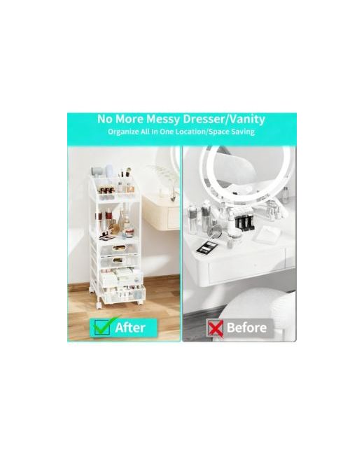 Large-capacity makeup organizer with six sections: top tray with removable dividers for brushes, dryer, straightener, daily lipstick and perfume open middle shelf for full-size cleanser, toner, lotion, remover four see-through mesh drawers for creams, masks, pads, palettes, jewelry and accessories.Durable rust-resistant frame, quick tool-free assembly. Weight: 0.15 pounds. Length: 11.61 inch. Width: 13.00 inch. Height: 34.00 inch.