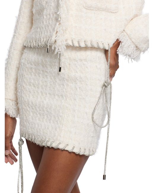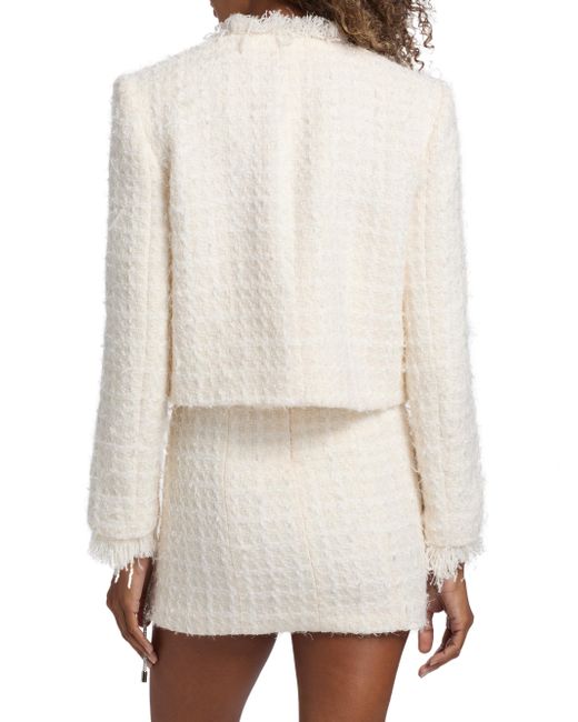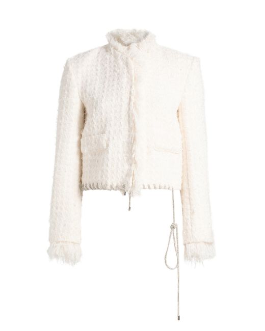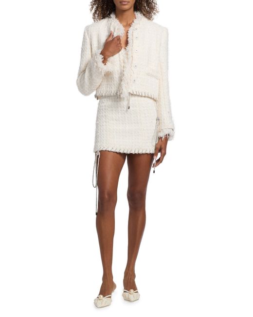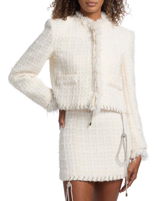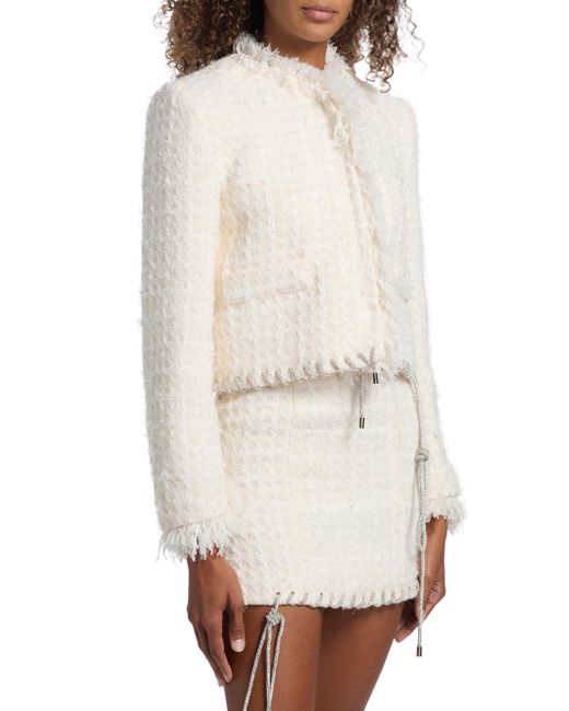 Area's Tweed Lady jacket flaunts a textured finish with a touch of wool, complete with hem whipstitching from a crystal-embellished cord. This piece includes a stand collar, fringe trim, and side flap pockets. Stand collar Long sleeves, fringe cuffs Side flap pockets Whipstitched hem Concealed front snap closure 70% polyester/30% wool Dry clean Imported SIZE & FIT Model measurements: 5'10" tall Model is wearing a US size Small ABOUT THE BRAND Founded in 2014 by designers Beckett Fogg and Piotrek Panszczyk in downtown New York City, AREA is a design studio with a bold perspective. The label focuses on innovative embellishments on its playful ready-to-wear and accessories. Infused with energy and eclecticism, AREA is a favorite pick for Hollywood starlets. Advanced European - Italian Collections > Area > Saks Fifth Avenue. Area. Color: Cream White. Size: XS.