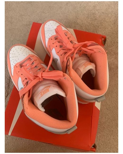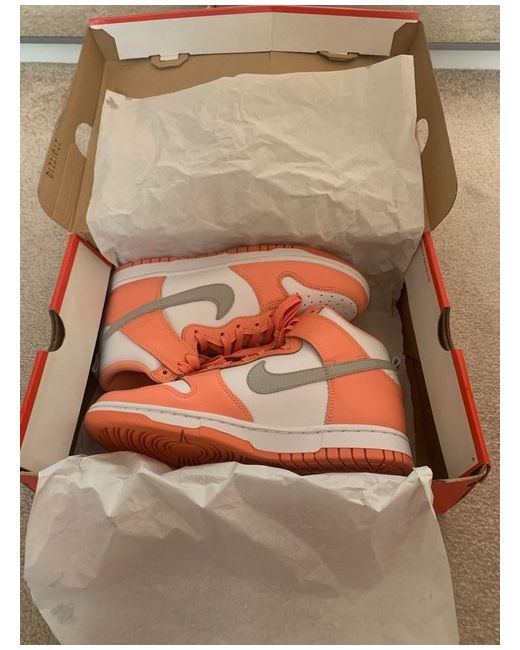 The Nike Dunks High Salmon and Grey trainers in UK shoe size 6 (US size 8) are a stylish and comfortable choice for women. With a high top design and fabric lining, these sneakers feature a trendy salmon and grey colour combination. The rubber outsole and foam insole provide durability and cushioning, making them perfect for everyday wear. The Nike Dunk High model, released in 2022, is a fashionable and modern addition to any woman's shoe collection.