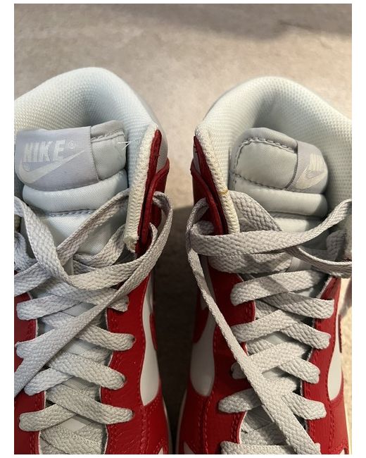 Elevate your sneaker game with these stunning Nike Dunk High Women's trainers. The striking red colour is sure to make a statement and adds a pop of colour to any outfit. Designed for women, these trainers are perfect for those who want to add a touch of sporty style to their wardrobe. Constructed with high-quality materials and a focus on comfort and style, these trainers are perfect for any occasion. Whether you're hitting the gym or running errands, these Nike Dunk High Women's trainers will keep you looking stylish and feeling comfortable all day long. So why wait? Add these must-have trainers to your collection today and step up your fashion game.