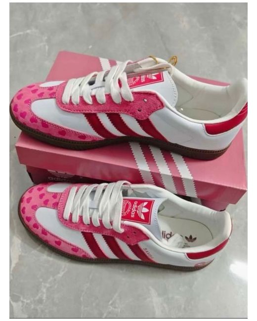 The Adidas Samba Size 7 Valentine trainers are a stylish and versatile choice for women looking for a casual shoe option. With a low top shaft style and lace-up closure, these sneakers feature a rubber cleat for added grip. The multicoloured design with the iconic adidas logo accents adds a touch of flair, while the leather upper material and foam insole provide comfort and durability. Perfect for the summer season, these trainers are part of the adidas Originals product line and are sure to make a statement in any outfit. New in box. Never worn. Lovely heart detail! Only selling as too big.