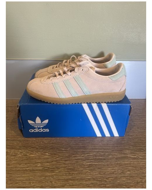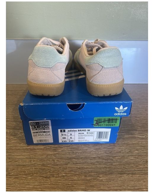 The product is a pair of Adidas Bermuda trainers in a pink and mint colour combination, UK size 5 (US size 6.5). These low-top sneakers feature a lace-up closure, rubber outsole, suede upper material, and standard shoe width for comfort. They are part of the Adidas Originals product line and are designed for casual occasions and walking activities. The logos on the shoes add a stylish touch to this breathable and versatile pair of trainers, perfect for women looking for a fashionable and comfortable option for everyday wear.