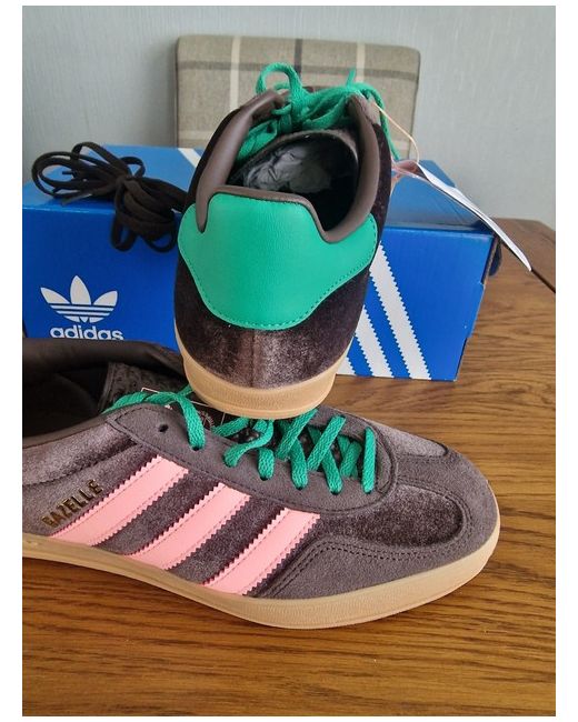 These are like a velour ....The adidas Gazelle Women's Size 8.5 is a stylish and comfortable trainer perfect for casual occasions. Featuring a low top design with a lace-up closure, this shoe offers overpronation support and a standard shoe width. The brown suede upper is complemented by a rubber outsole for added durability, while the foam insole provides extra comfort. This adidas Gazelle model from the product line is a great choice for women looking for a sleek sneaker for spring.