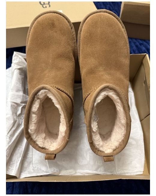 These Brand New Unworn UGG platform boots are a stylish and practical choice for the winter season. The ankle shaft style and round toe shape offer both comfort and fashion, while the brown suede upper and standard shoe width make them suitable for casual occasions. With the iconic UGG Australia logo accent and rubber outsole, these boots are a popular choice for women looking for a trendy and versatile footwear option. The Ugg Classic product line ensures quality and reputation, making these boots a must-have for any wardrobe.