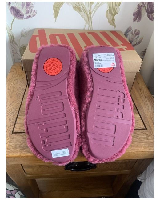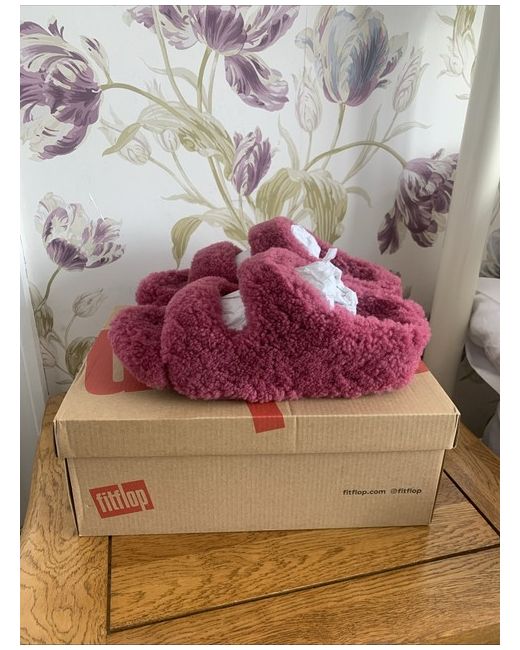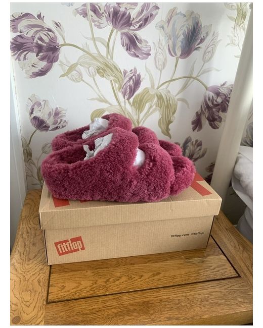These are lovely shearling fit flops . I was bought these for Christmas . A lovely present but I can’t unfortunately wear wool . The colour is ruby and I believe they were about £100 . I would’ve worn them as sliders slippers but they have a robust wobble board sole , so could just as easily be worn outside . I have a few fit flops as they’re so comfy . UK6 brand new with box