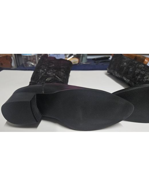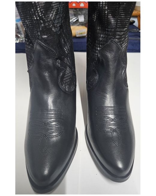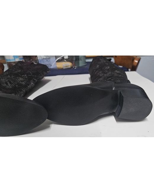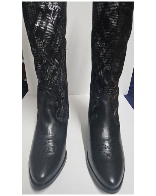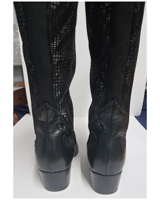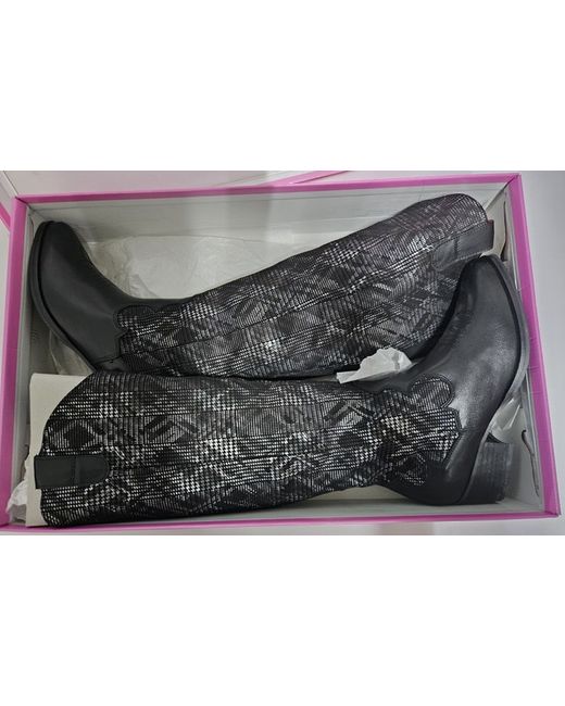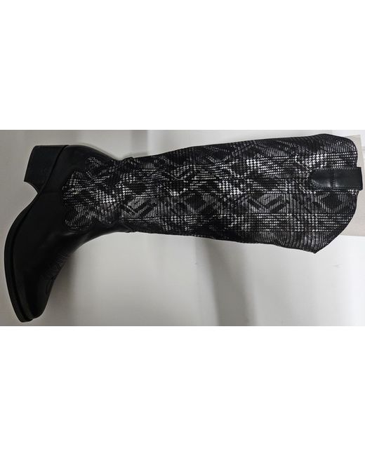 New black knee high boots, Knightsbridge design with box and tissue paper and card inserts in boots. Never worn. Black leather foot with black and silver argyle style pattern on leg part of boots. Red inside of boot.