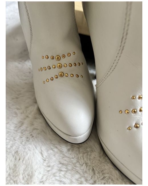 The Carvela Calf Boots Sizzle in UK size 7 (EU 40) are stylish mid-calf boots with a high heel height, perfect for many occasions. Made from synthetic material, these white boots feature a cowboy style design. The Carvela brand ensures quality and fashionable appeal, making these boots a versatile and chic addition to any woman's wardrobe.