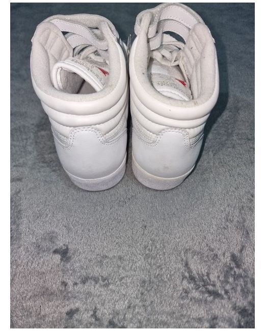 These Reebok high-top trainers in size 3 are perfect for casual occasions, with a classic white colour and comfortable rubber outsole. The lace-up closure and standard shoe width make them easy to wear, while the leather upper material adds a stylish touch. Featuring the iconic Reebok logo as an accent, these trainers are a timeless addition to any woman's wardrobe, ideal for summer days.