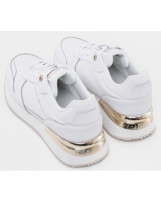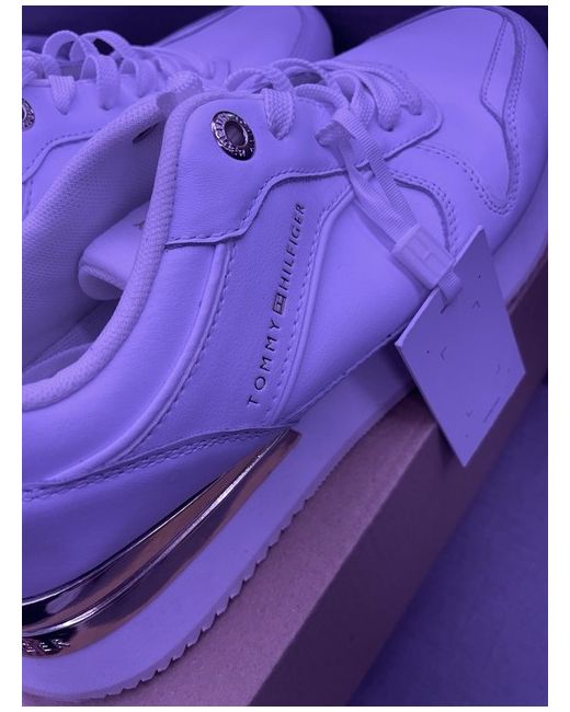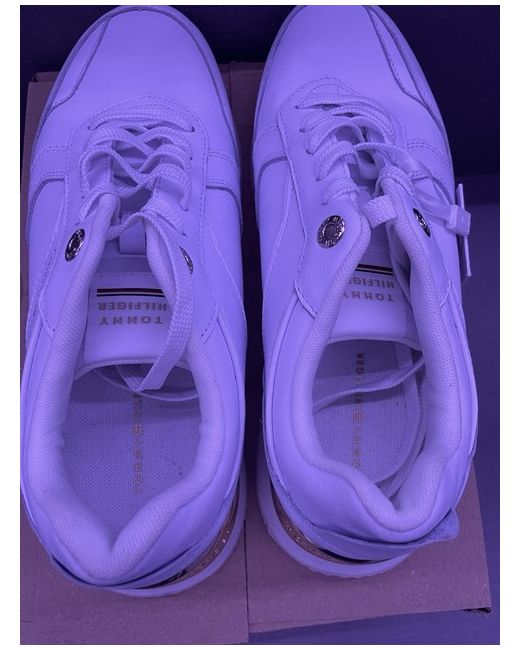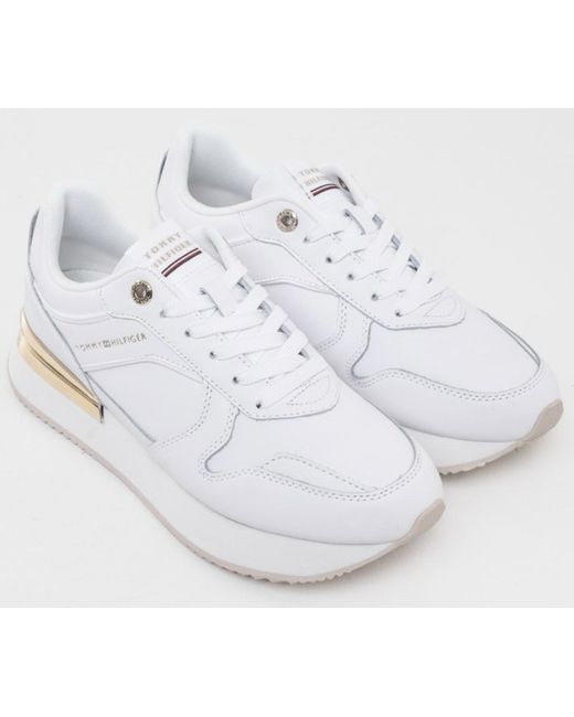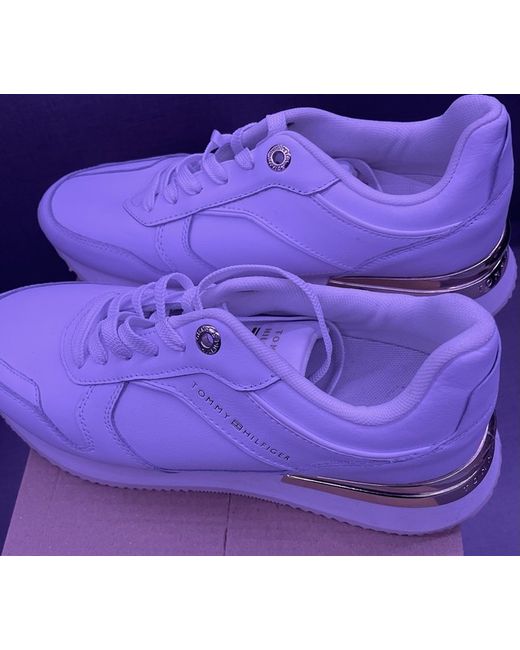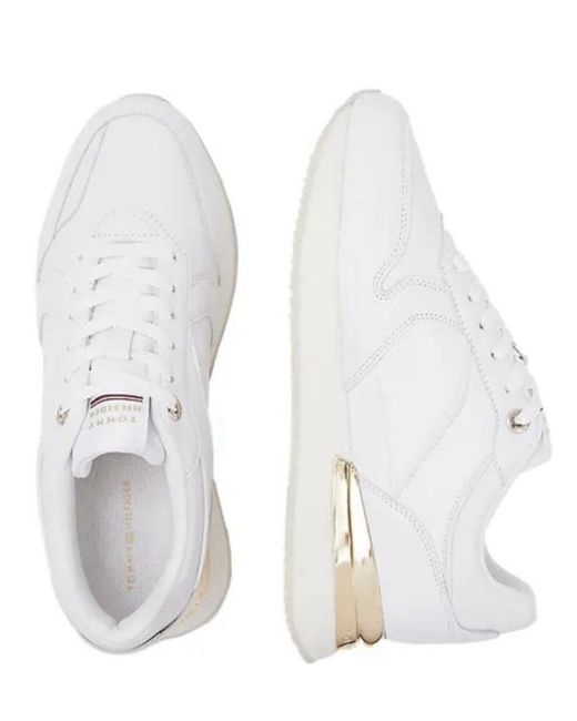 The Tommy Hilfiger Women's Elevated Feminine Runner Trainers in UK size 7 are stylish and comfortable shoes perfect for casual occasions. Made from white leather with a lace-up closure, these trainers feature the Tommy Hilfiger logo as accents. The rubber outsole provides a sturdy grip, while the standard shoe width ensures a comfortable fit. Ideal for summer and walking activities, these sneakers are a trendy addition to any woman's wardrobe.