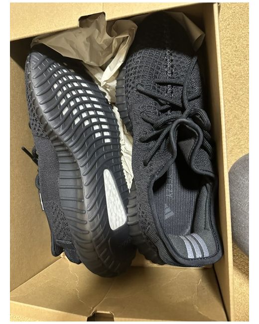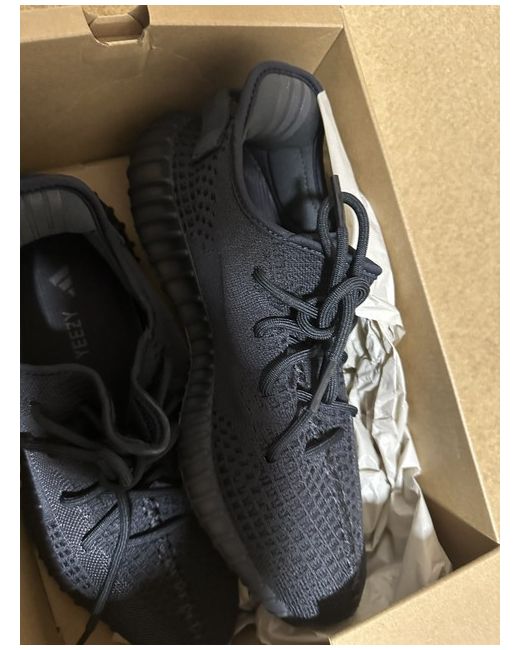 The product is a pair of Yeezy sneakers in a low top style, with a black colour and rubber outsole. They feature a lace-up closure, making them ideal for casual occasions and walking. These trainers offer comfort and standard shoe width, suitable for both men and women. The design does not have a pattern or signature, and they are not vintage or customised. Perfect for those looking for a stylish and comfortable sneaker option for sports or everyday wear.