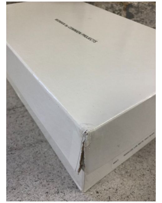 Slight scuff on shoe (right shoe). Box ripped on corner. flaws include -.