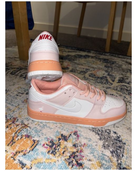 The Nike Dunk Low Women's Trainers in white and pink, size 5, are a stylish and comfortable choice for casual occasions. With a low top design, lace-up closure, and rubber outsole, these trainers are perfect for everyday wear. The pink colour adds a trendy touch, while the Nike logo accents give them a signature look. Featuring a foam insole for added comfort and leather upper material, these sneakers are a versatile addition to any woman's wardrobe.