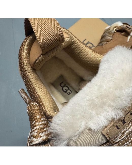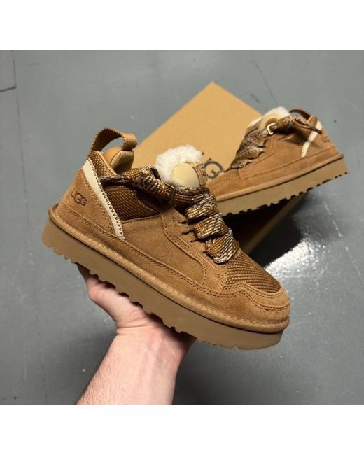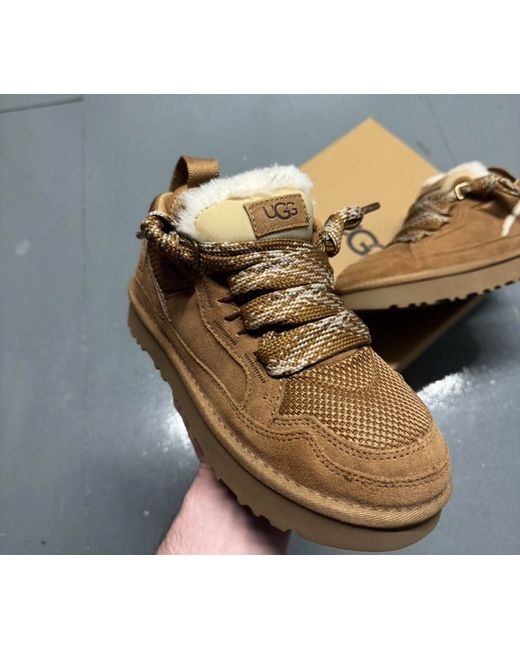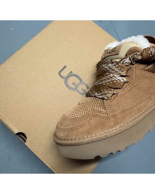 The UGG Lowmel Women's Trainers in Chestnut, Size UK 6, are a stylish and comfortable choice for casual occasions. Made with suede upper material and featuring a lace-up closure, these trainers offer a standard shoe width for a comfortable fit. The rubber cleat type provides good traction, making them suitable for the winter season. The classic UGG design combined with the brown colour and sneaker style make these trainers a versatile addition to any woman's wardrobe.