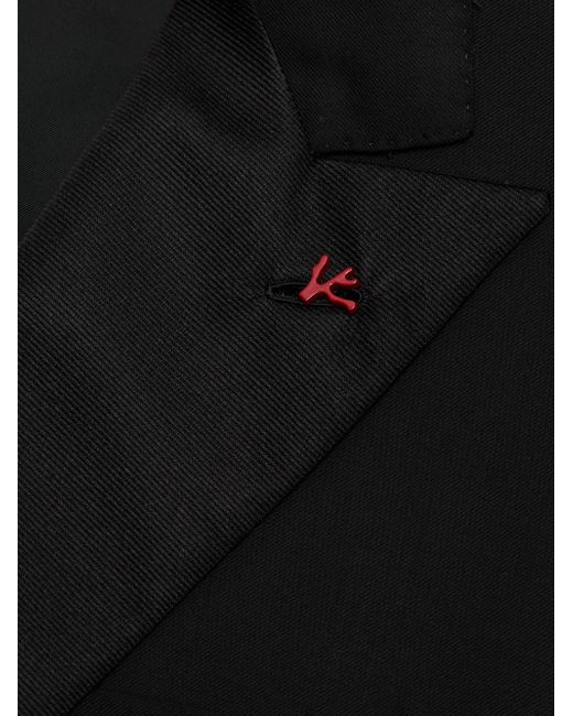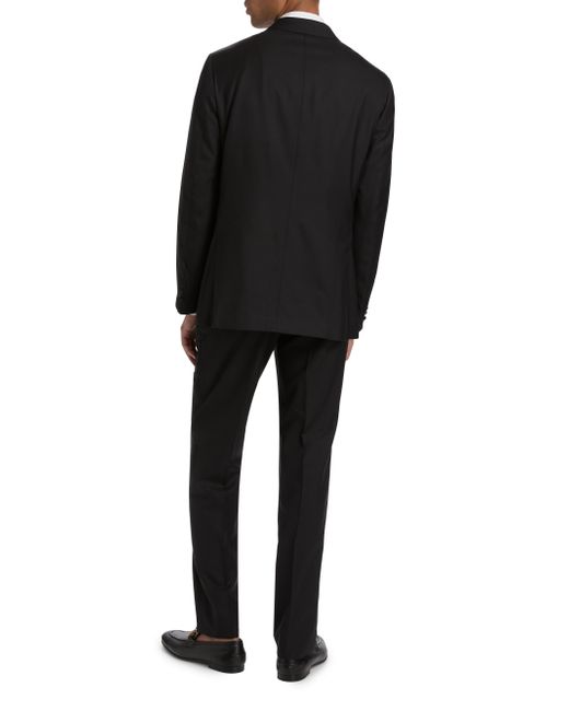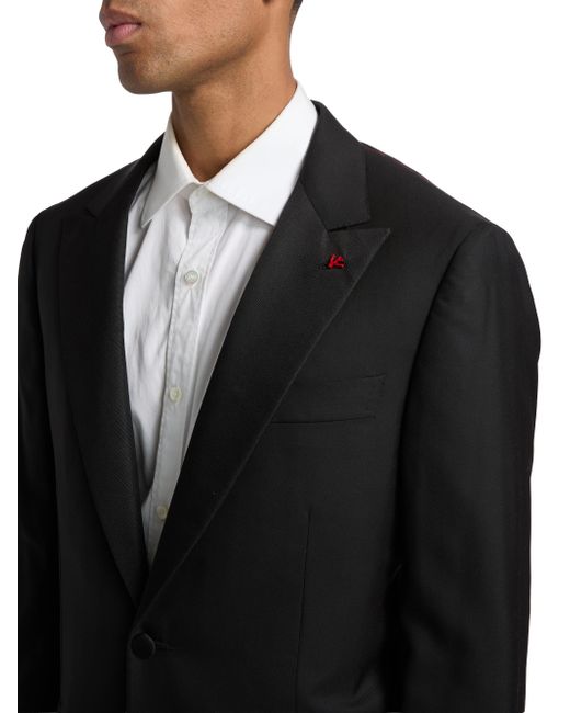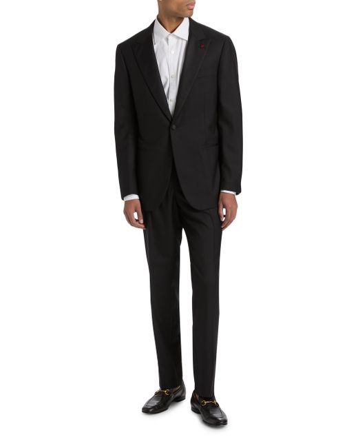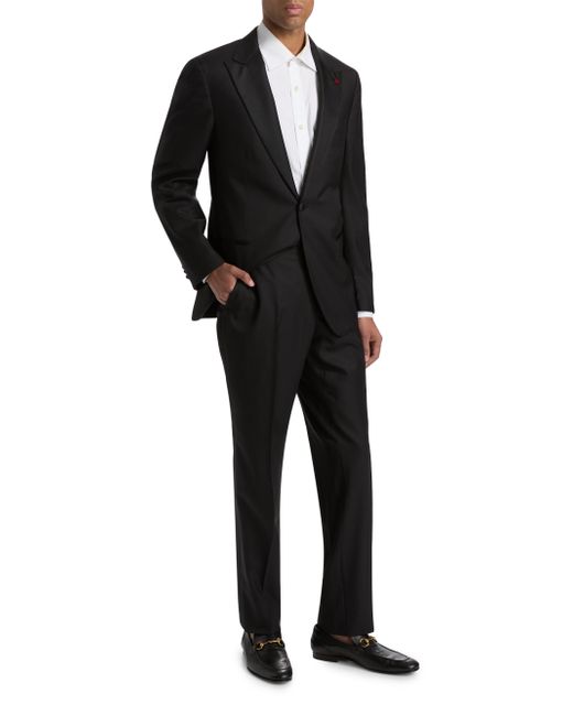 This Isaia tuxedo is crafted of wool in Italy. The single-breasted jacket is detailed with peak lapels and side besom pockets, while the trousers offer a crease-front silhouette.100% wool. Lining: 100% cupro. Dry clean. Made in Italy. JACKET Peak lapels, buttonhole Long sleeves, button cuffs Chest welt pocket Side besom pockets Button-front closure TROUSERS Crease-front Side on-seam pockets SIZE & FIT About 28" from shoulder to hem Inseam: about 35.5" Model measurements: 6'2" tall, 40" chest, 31" waist Model is wearing a US size 40R ABOUT THE BRAND Since its founding in 1920, Isaia has been among the storied tailoring houses based in Naples, Italy. The family business began as a fabric purveyor, and more than a century later, Isaia is renowned for its signature unstructured jackets that perfectly embody the Neapolitan ethos of easy luxury. Men Luxury Coll - Mens Isaia > Isaia > Saks Fifth Avenue. Isaia. Color: Black. Size: 42.
