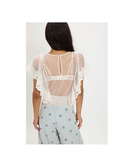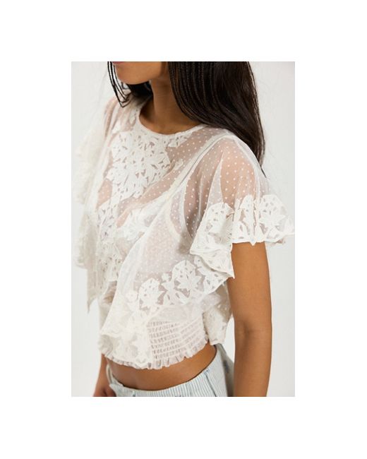 Endlessly romantic, this femme top features a striking semi-sheer fabrication, a fitted, smocked waistband, and a looser bust for added dimension. * Boat neckline * Ruffle sleeves * Embroidered details * Lace trim Eclipse Garden Top at Free People in Ivory, Size: XS