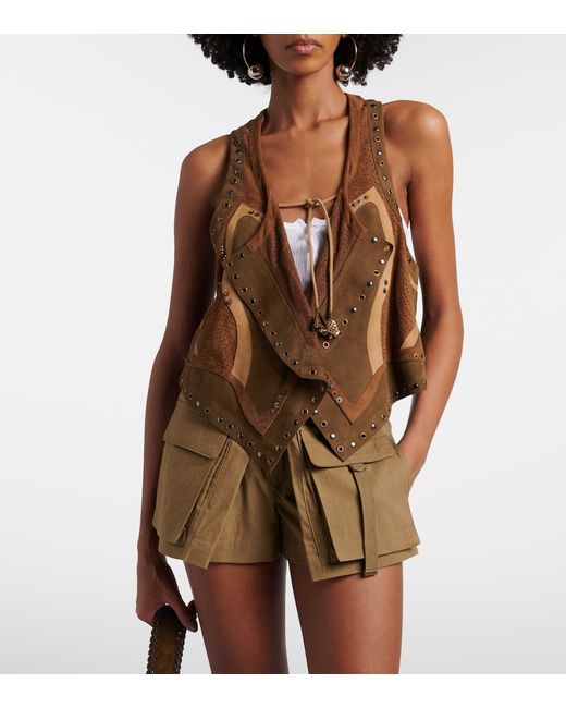 Material: 100% lamb leather (suede). Care instructions: specialist clean. Made in India. Designer color name: Bronze. Trim: 100% lamb leather (suede). Details: 100% metal. Closure: self-ties. Hem: uneven. Contains non-textile parts of animal origin. Leather. Includes: garment bag.