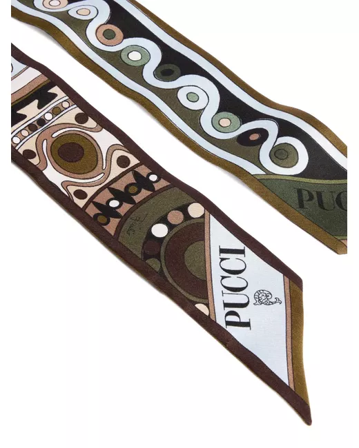 An elegant and versatile accessory, perfect for adding a touch of color to any look. This silk twill bandeau features pointed edges and a refined interplay of prints in intriguing shades of khaki and blue.Lightweight and sophisticated, it can be worn in a variety of ways: as a headband, around the wrist, or tied to a bag for a distinctive detail that expresses the unmistakable Pucci style. khaki and blue printed silk twill pointed edges dimensions: 5x120 cm made in Italy To offer you a unique Pucci garment, we use an all-over print that makes the product unrepeatable. Therefore, the pattern print may vary from the one displayed in the photo.
