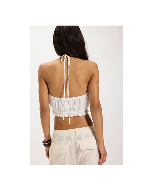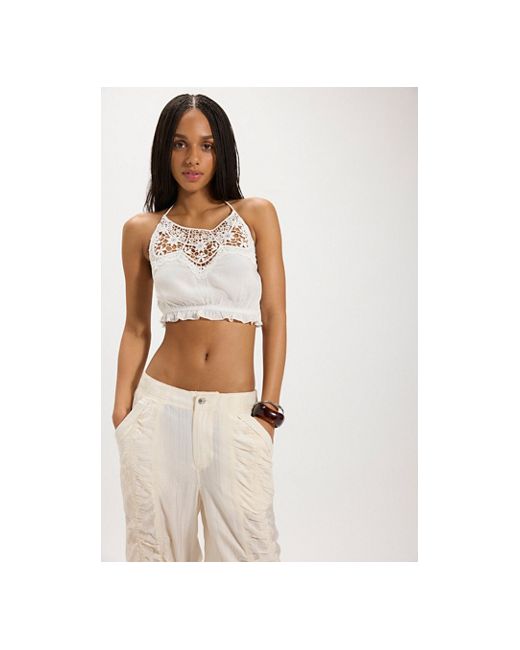 Endless sunny days await in this cropped blouson top from Intimately, featuring a lightweight woven fabrication with floral crochet at the neckline and a cinched bottom hem for a flattering, puffed silhouette. * Lightweight woven fabrication * Blouson crop with an adjustable neck tie * Halter neckline * Low-back design Crowd Pleaser Blouson Crop Top by Intimately at Free People in Clean Ivory, Size: XS
