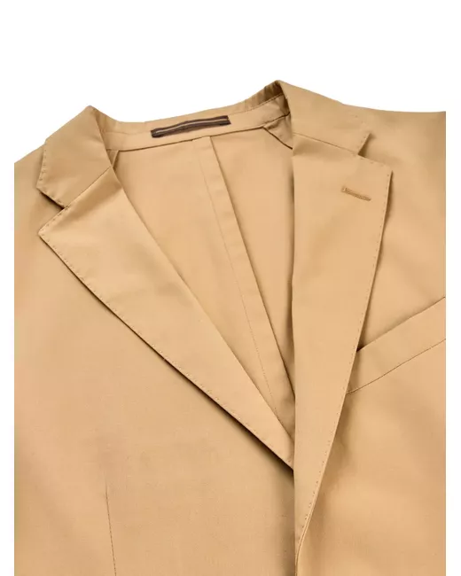 beige notched lapels front button fastening long sleeves two front patch pockets buttoned cuffs
