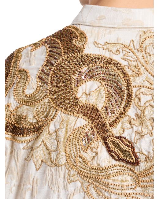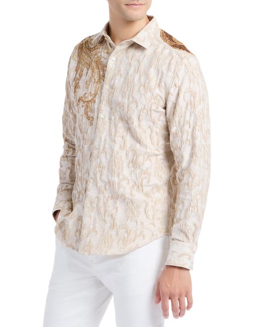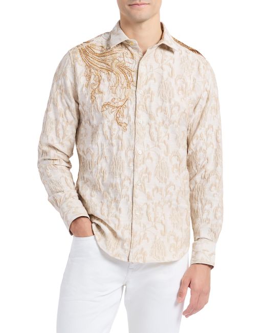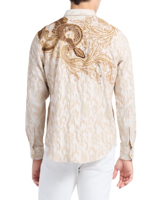 Robert Graham's cotton-blend shirt features a 3D jacquard with an oversized paisley design. This style is intricately layered with hand-applied wooden and golden beads into a striking serpent motif across the shoulder and back. Point collar Long sleeves, button cuffs Shirttail hem Button-front closure 53% cotton/34% viscose/11% nylon/2% elastane Dry clean Imported SIZE & FIT Model measurements: 6'2" tall, 40" chest, 31" waist Model is wearing a US size Medium. Mens Modern Coll & Outer - Contemp Classic Collecti > Robert Graham > Saks Fifth Avenue. Robert Graham. Color: Khaki. Size: Small.