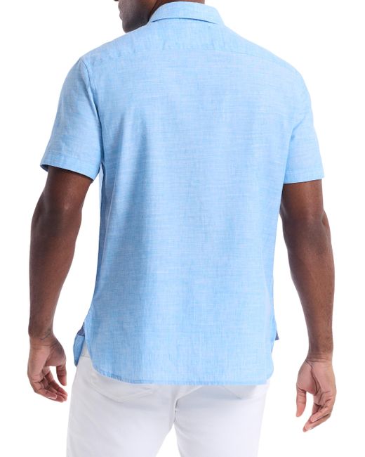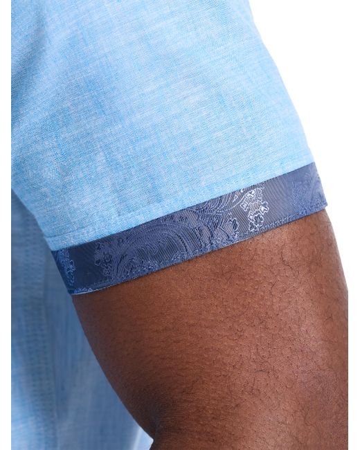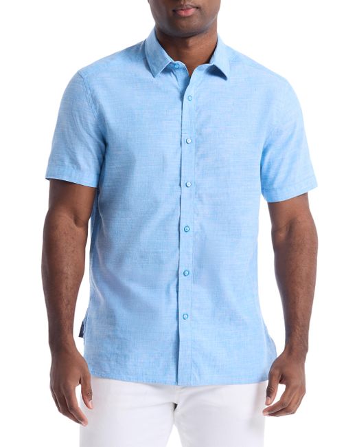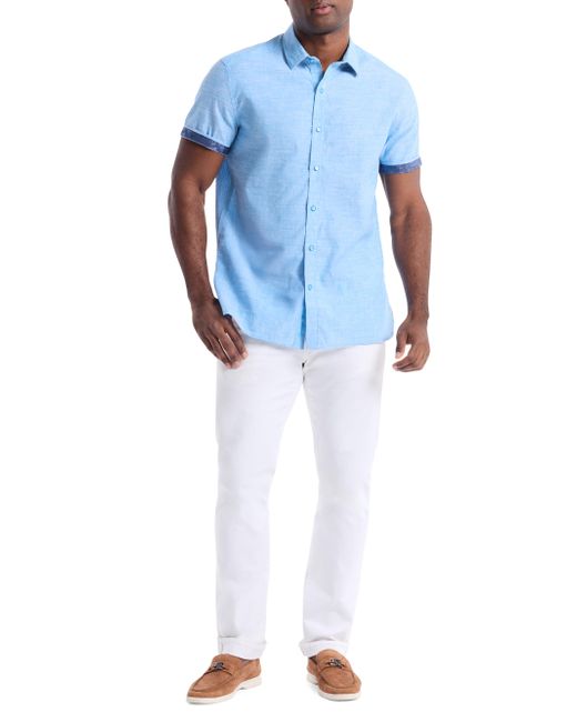 This Sutton shirt from Robert Graham is crafted of a cotton and linen blend, featuring a spread collar, contrast-trimmed cuffs, and shirttail hem. Spread collar Short sleeves Shirttail hem Button-front closure 51% linen/49% cotton Machine wash Imported SIZE & FIT Model measurements: 6'2" tall, 40" chest Model is wearing a US size Medium. Mens Modern Coll & Outer - Contemp Classic Collecti > Robert Graham > Saks Fifth Avenue. Robert Graham. Color: Blue. Size: Small.