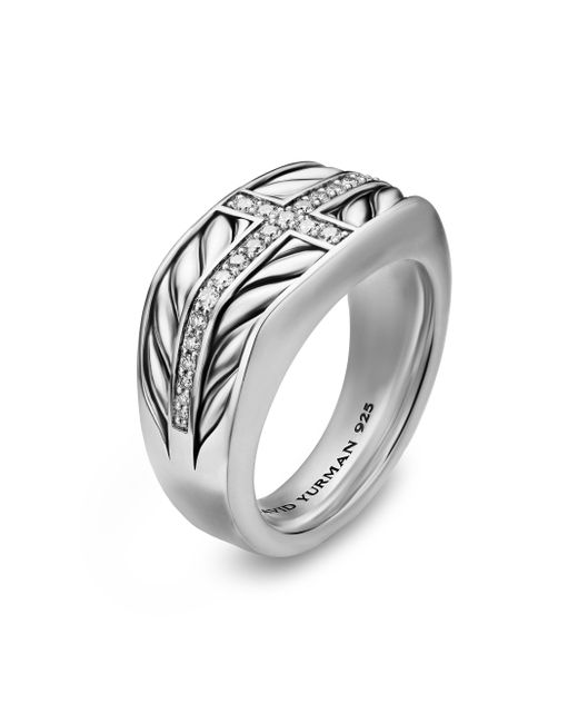 Marked by its double-helix pattern, Chevron is a mirror image of Cable, the house's signature motif. The ancient V-shaped design offers a sense of modern sophistication, expertly crafted in refined materials, with deep cuts, precise angles, and a play of light and dark to evoke a feeling of forward momentum in the pursuit of excellence. Its elevated look fuses luxury and practicality for everyday wear, imbuing an essence of timelessness and versatility. Sterling silver Pavé-set diamonds, 0.31 to 0.34 total carat weight Ring, 12.5mm Imported ABOUT THE BRAND David, a sculptor, and his wife, Sybil, a painter, launched their innovative jewelry brand in 1980 in New York City. Since then, the American design house has pioneered cutting-edge collections-from its iconic combination of sterling silver and diamonds to signature pinky rings. Today, with their son Evan, the Yurmans continue to deliver timeless pieces inspired by nature, art, ancient symbols and Manhattan's stunning architecture. Lsd Jewelry - David Yurman > David Yurman > Saks Fifth Avenue. David Yurman. Color: Diamond. Size: 12.5.