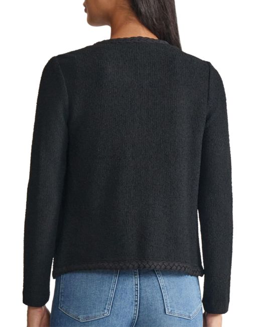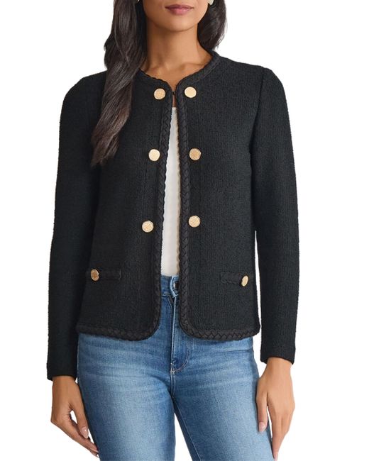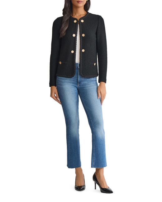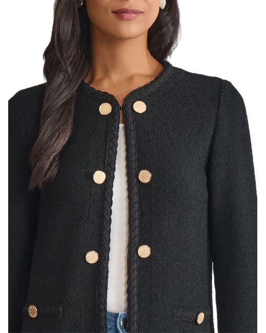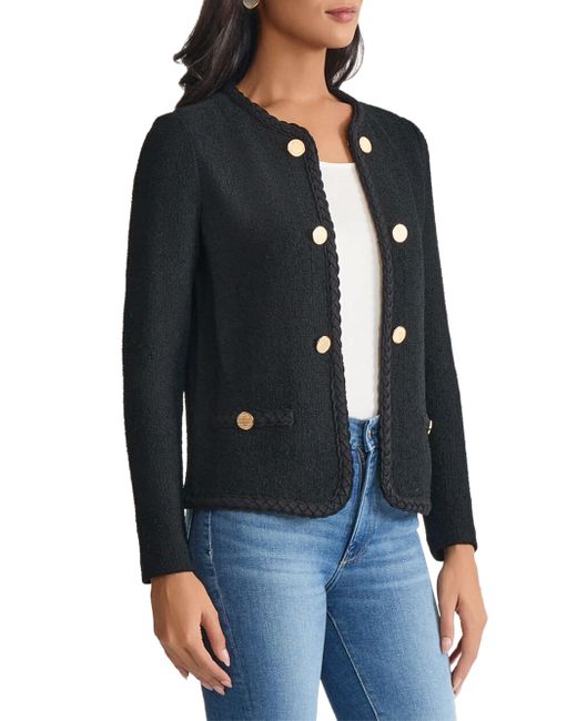 This Misook knit jacket features a stand collar, shoulder pads, and a braided trim. Stand collar Padded shoulders Long sleeves Button-front closure 52% acrylic/28% nylon/11% viscose/9% rayon Hand wash Imported SIZE & FIT About 23" from shoulder to hem Model measurements: 5'10" tall Model is wearing a US size Small. Modern Collections - Modern Coll > Misook > Saks Fifth Avenue. Misook. Color: Black. Size: Large.