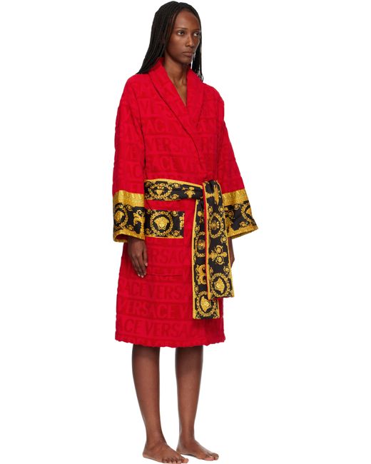 Cotton terrycloth bathrobe. · Jacquard logo pattern and Barocco poplin trim throughout · Shawl collar · Belt loops with detachable self-tie belt · Patch pockets at waist · Dropped shoulders Supplier color: Red