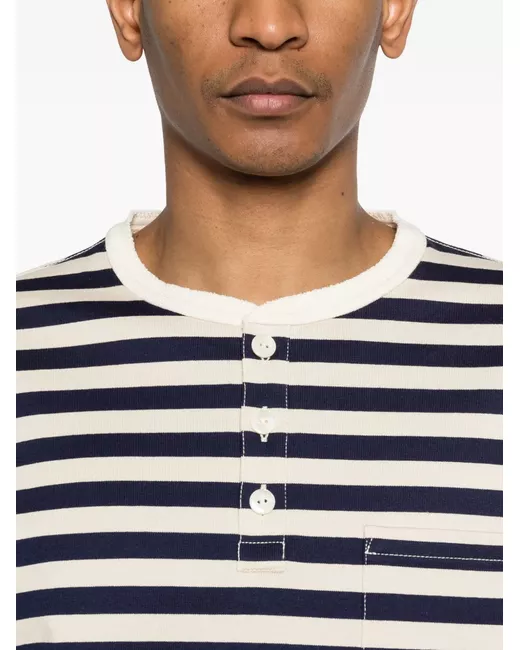 blue/beige striped button placket chest pocket long sleeves