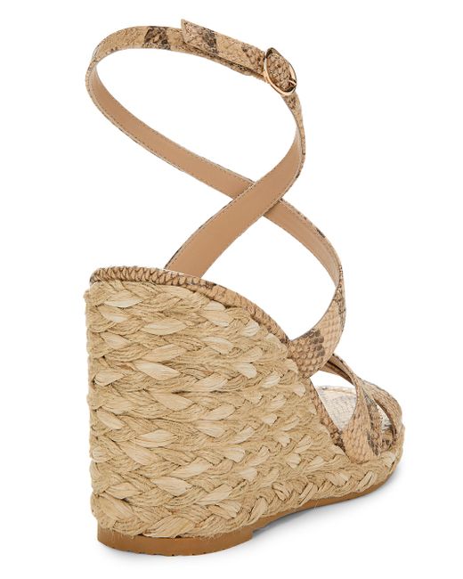 Crafted of snake-embossed leather, the Alyssa wedge sandals from Stuart Weitzman feature an espadrille wedge heel. Open toe Buckle closure Leather upper Leather lining TPU sole Made in Spain SIZE Wedge heel: about 4" (100mm) Platform: about 0.75" (20mm) ABOUT THE BRAND Designer Stuart Weitzman started his career designing for his father's shoe company, before launching his own brand in 1986. Known for his glamorous pumps and over-the-knee boots, Weitzman has also incorporated unique materials in his designs, ranging from Lucite and wallpaper to cork, vinyl and even gold. Today, the label continues to create classic, feminine silhouettes that balance both comfort and style. Women's Shoes - Stuart Weitzman W Shoes > Stuart Weitzman > Saks Fifth Avenue. Stuart Weitzman. Color: Camel. Size: 5.5.