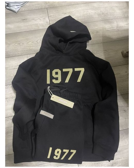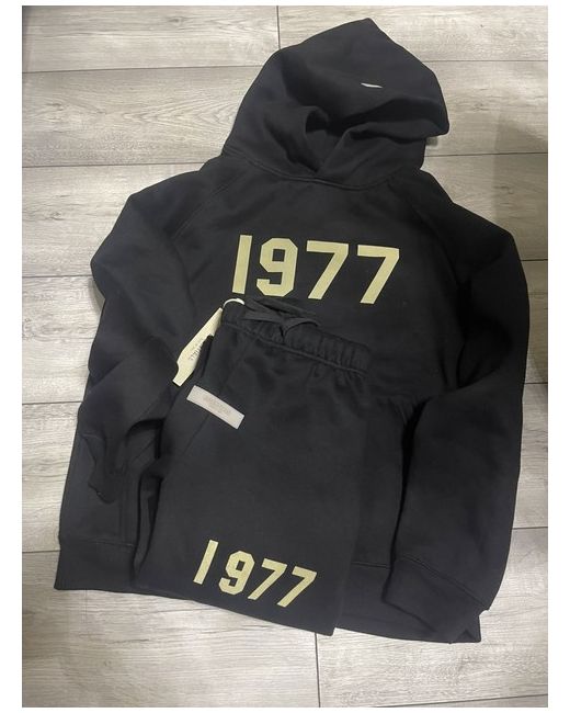 The Essentials Black1 1997 is a men's tracksuit in a sleek black colour, perfect for activewear. This sweatsuit set includes a comfortable sweatshirt and matching bottoms, both featuring the Essentials brand logo. Available in size M, this stylish and versatile tracksuit is ideal for men looking for a classic and practical wardrobe staple. Ideal for casual occasions or workouts, this tracksuit combines fashion and functionality effortlessly.