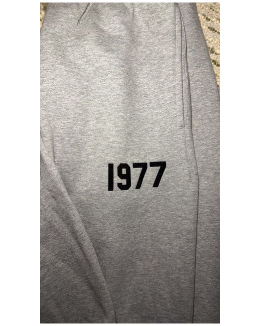 This 1977 dark oatmeal essentials tracksuit in size large is a stylish and comfortable two-piece set perfect for gym and training activities in the winter season. Made from soft cotton fleece, the hoodie features a relaxed fit with a drawstring closure and long sleeves, while the bottoms have a 30-inch inside leg. The grey colour and logo accents add a modern touch to this classic sweat suit from the brand Essentials, making it a versatile addition to any man's activewear wardrobe. Machine washable for easy care, this tracksuit is a practical yet fashionable choice for any occasion.