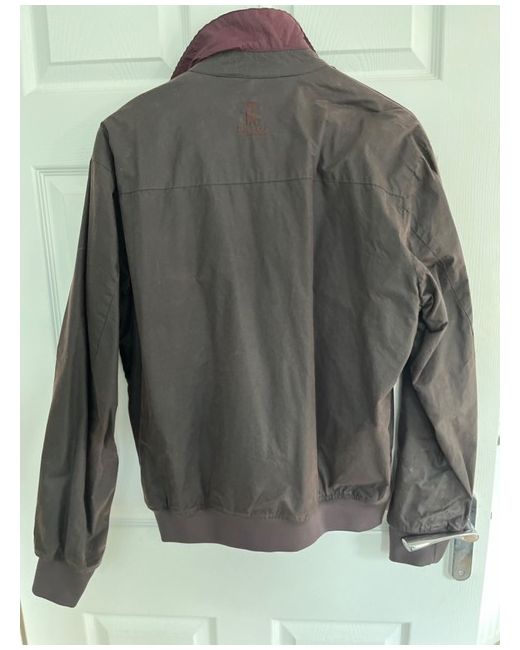 The Barbour Storm Force windcheater jacket in size large is a stylish and practical choice for men. Made from 4oz. lightweight waxed cotton, it features a polyester lining for added warmth. The brown colour and windbreaker style make it versatile for various occasions, while the bomber jacket design adds a touch of sophistication. This jacket is a must-have for those looking for a durable and fashionable outerwear option.